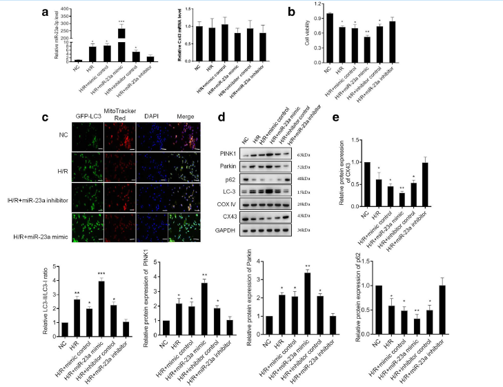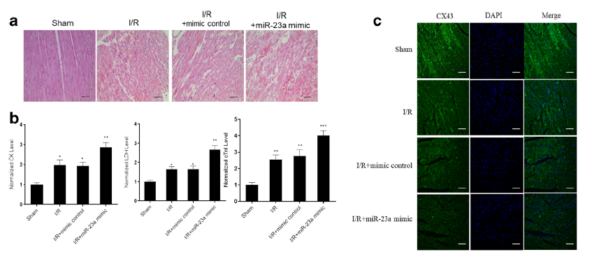 《Inflammation》期刊报道了MiR-23a通过直接靶向CX43和调节有丝分裂吞噬作用参与心肌缺血/再灌注损伤。题为“MiR-23a Is Involved in Myocardial Ischemia/Reperfusion Injury by Directly Targeting CX43 and Regulating Mitophagy“的文章中,研究人员通过RNA体内转染实验(EntransterTM-in vivo, Engreen)、数据库预测和荧光素酶分析证明miR-23a直接与CX43 3′的UTR结合导致CX43降解,表明miR-23a对心肌I/R损伤具有促进作用。这些结果表明靶向miR-23a或许是对抗I/R诱发心脏病的新疗法。