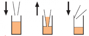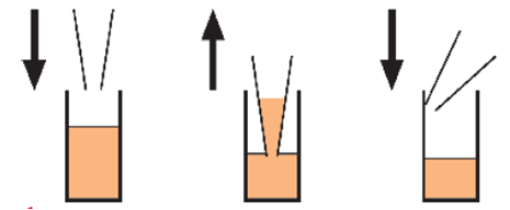 2)平缓松开控制按钮,否则液体进入吸头过速会导致液体倒吸人移液器内部,产生反冲和气泡,导致移液体积不准确。
