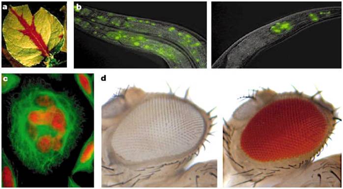 图为dsRNA可以沉默目标基因。在植物中,通过注入人工合成的RNA病毒或者是插入反向重复序列可以诱导目标基因沉默。在线虫中,沉默也可以用注射dsRNA的方式来诱导。这两种生物体中,沉默是系统的并且传遍全身。a) 沉默信号从脉杆传到叶片组织。绿色是绿色荧光蛋白;红色是叶绿素荧光,可以在绿色荧光蛋白被沉默后看出。b,c)通过实验,使得线虫的核中表达绿色荧光蛋白。实验者在左边加上对照dsRNA,右边加上绿色荧光蛋白的dsRNA。一些神经元核仍然可以检测到荧光,对应于少量的蛋白质表达。c)Hela细胞加上ORC6 siRNA之后,针对微管蛋白(绿色)和DNA(红色)进行染色。ORC6的去除导致多核细胞的积累。稳定的沉默也可以通过表达发夹结构或者折回的双链RNA的表达来实现。d)当和野生型的果蝇相比(右边),成体果蝇中表达控制白色基因的发夹同源物(左边)导致眼睛丧失色素。