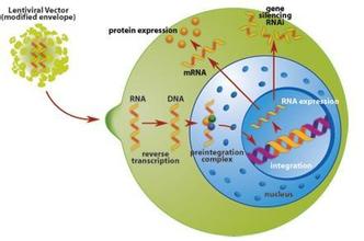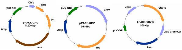 慢病毒表达载体包含了包装、转染、稳定整合所需要的遗传信息。慢病毒包装质粒可提供所有的转录并包装RNA 到重组的假病毒载体所需要的所有辅助蛋白。为产生高滴度的病毒颗粒,需要利用表达载体和包装质粒同时共转染细胞,在细胞中进行病毒的包装,包装好的假病毒颗粒分泌到细胞外的培养基中,离心取得上清液后,可以直接用于宿主细胞的感染,目的基因进入到宿主细胞之后,经过反转录,整合到基因组,从而高水平的表达效应分子。