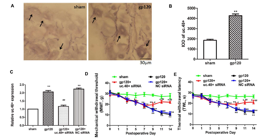 因此,uc.48+siRNA敲除显著减轻HIV gp120诱导的神经炎症疼痛,这为神经炎疼痛治疗提供了重要的理论依据。
