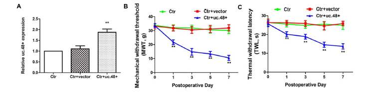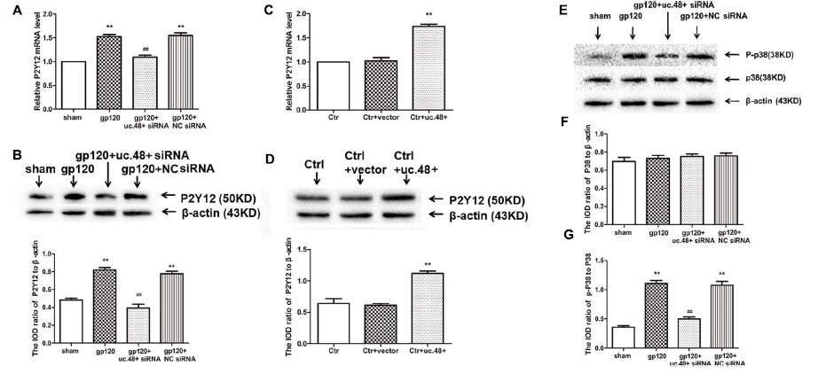 体内转染实验(EntransterTM-in vivo, Engreen)证实了uc.48+的沉默能够降低糖蛋白120大鼠背根神经元中P2Y12的表达和活性。