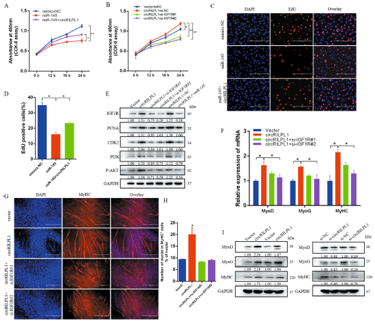 该团队在《Cell Death & Disease》期刊上发表了题为“CircRILPL1 promotes muscle proliferation and differentiation via binding miR-145 to activate IGF1R/PI3K/AKT pathway”的论文。研究人员利用体内转染试剂(EntransterTM-in vivo, Engreen)将circRILPL1注射到小鼠体内,发现了CircrillPL1能帮助激活IGF1R/PI3K/AKT信号,从而促进肌肉增殖,增加细胞分化,抑制肌肉细胞凋亡,这或许可作为肌肉萎缩的一种潜在治疗药物。