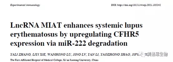 中国西安交通大学医学院在最新的研究中首次表明:lncRNA MIAT 通过体内降解miR-222来上调 CFHR5 表达,增强狼疮疾病的活动,并在《Experimental immunology》期刊上发表了题为 “LncRNA MIAT enhances systemic lupus erythematosus by upregulating CFHR5 expression via miR-222 degradation“论文。