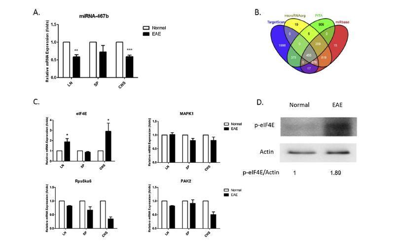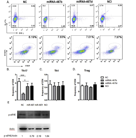 该研究团队首次表明了eIF4E在促进Th17细胞方面的积极作用,miRNA-467b通过靶向eIF4E抑制Th17细胞的分化和功能,从而缓解了自身免疫性脑脊髓炎。该项研究成果发表在《Molecular Immunology》期刊上(“miRNA-467b inhibits Th17 differentiation by targeting eIF4E in experimental autoimmune encephalomyelitis”)。研究人员借助体内转染试剂(EntransterTM-in vivo, Engreen)将miRNA-467b mimic注射到小鼠体内并通过qPCR和western blot检测获得数据,完成了该实验。