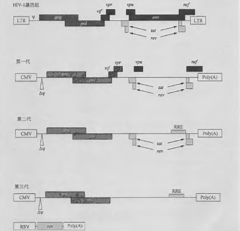 图1 基于HIV-1 的慢病毒载体包装系统。(上两个结构来自于Dull et al. 1998 。下两个结构来自于Zufferey et al. 1997 ) 。