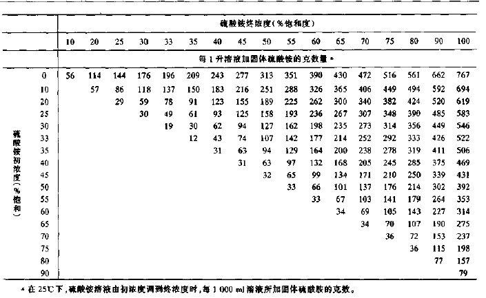 1.调整硫酸铵溶液饱和度计算表(25℃)