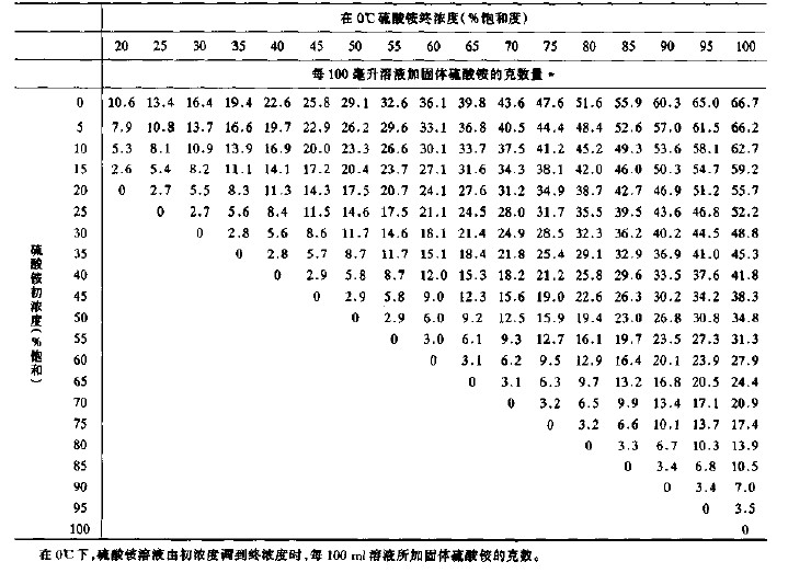 2.调整硫酸铵溶液饱和度计算表(0℃)