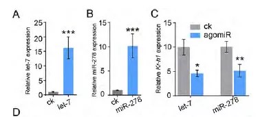 发表在《Development》上的一篇题为“The microRNAs let-7 and miR-278 regulate insect metamorphosis and oogenesis by targeting the juvenile hormone early-response gene Krüppel-homolog 1”的文章中表述:将agomiR与体内RNA转染试剂(Engreen)混合处理后,在蜕皮24小时内的4龄若虫和成虫出现后12小时内的成年雌性分别腹腔注射0.5 nmol和1 nmol agomiR,qPCR实验表明实验组miR-278和let-7的表达水平显著上升。