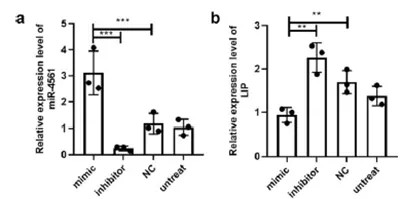 发表在《COMMUNICATIONS BIOLOGY》期刊上题目为“MicroRNA expression profile in Lampetra morii upon Vibrio anguillarum infection and miR-4561 characterization targeting lip”的论文写道:根据制造商的说明,使用含有 10% 葡萄糖的 Entranster(Engreen,北京,CHN)试剂将 miR-4561 模拟物、抑制剂和 NC 转染到七鳃鳗的神经上体组织中,并通过 miR-4561的 qRTPCR 评估转染效率,注射mimic组的miR-4561表达较对照组显著上升,注射inhibitor组的表达较对照组显著下降。