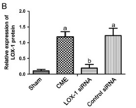 发表在《Journal of Cardiovascular Pharmacology and Therapeutics》期刊上题目为“Coronary Microembolization Induces Cardiomyocyte Apoptosis in Swine by Activating the LOX-1-Dependent Mitochondrial Pathway and Caspase-8-Dependent Pathway”文章中描述: 将总质量为 300 mg 的 LOX-1 siRNA 或对照siRNA用 600 mL 转染试剂(Entranster-in vivo;Engreen)通过上下吹打溶液充分混合。 然后通过1.8F输液导管将混合物注入猪的LAD动脉,然后通过1.8F输液导管将混合物注入猪的LAD动脉,然后注射2mL生理盐水。实验组的LOX-1蛋白表达显著下降。