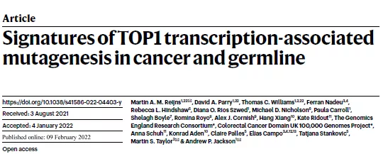《Nature》最新报道了癌症和生殖系中的 TOP1 转录相关诱变。突变情况由许多过程塑造,基因区域易受突变影响,但同时受到转录偶联修复的保护。在微生物中,转录诱变产生影响,但在高等真核生物中的影响仍有待确定。ID4 -a,指的是转录相关的诱变导致一种癌症相关的插入 – 缺失 突变特征,发生短片段(2 到 5 个碱基对)的缺失 。哺乳动物中的缺陷核糖核苷酸的切除和修复与 ID4 相关,突变发生在 TNT 序列基序处,表明基因组嵌入核糖核苷酸位点的拓扑异构酶 1 (TOP1) 活性是该机制的基础。这种 TOP1 介导的缺失发生在体细胞中,也发生在生理环境中,导致生殖系中的基因插入、缺失突变。因此,尽管拓扑异构酶可以防止基因组的不稳定性,但它们的活性也可能是人类基因组突变的重要来源。