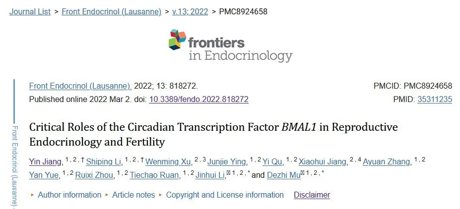 2022年3月2日,Yin Jiang 等人在Front Endo-crinol(Lausanne)上发表了一篇题为Critical Roles of the Circadian Transcription Factor BMAL1 inReproductive Endocrinology and Fertility 的文章,揭示了BMAL1在生育能力和生殖内分泌学中的重要作用。