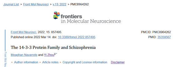 2022年3月14日,发表于Frontuers in Molecular Neuroscience 的一篇题为The 14-3-3 Protein Family and Schizophrenia的文章表明14-3-3家族与精神分裂症有牵连。此外,文章还讨论了14-3-3蛋白的改变可能有助于精神分裂症样表型的机制,如多巴胺能、谷氨酸能和细胞骨架失调。